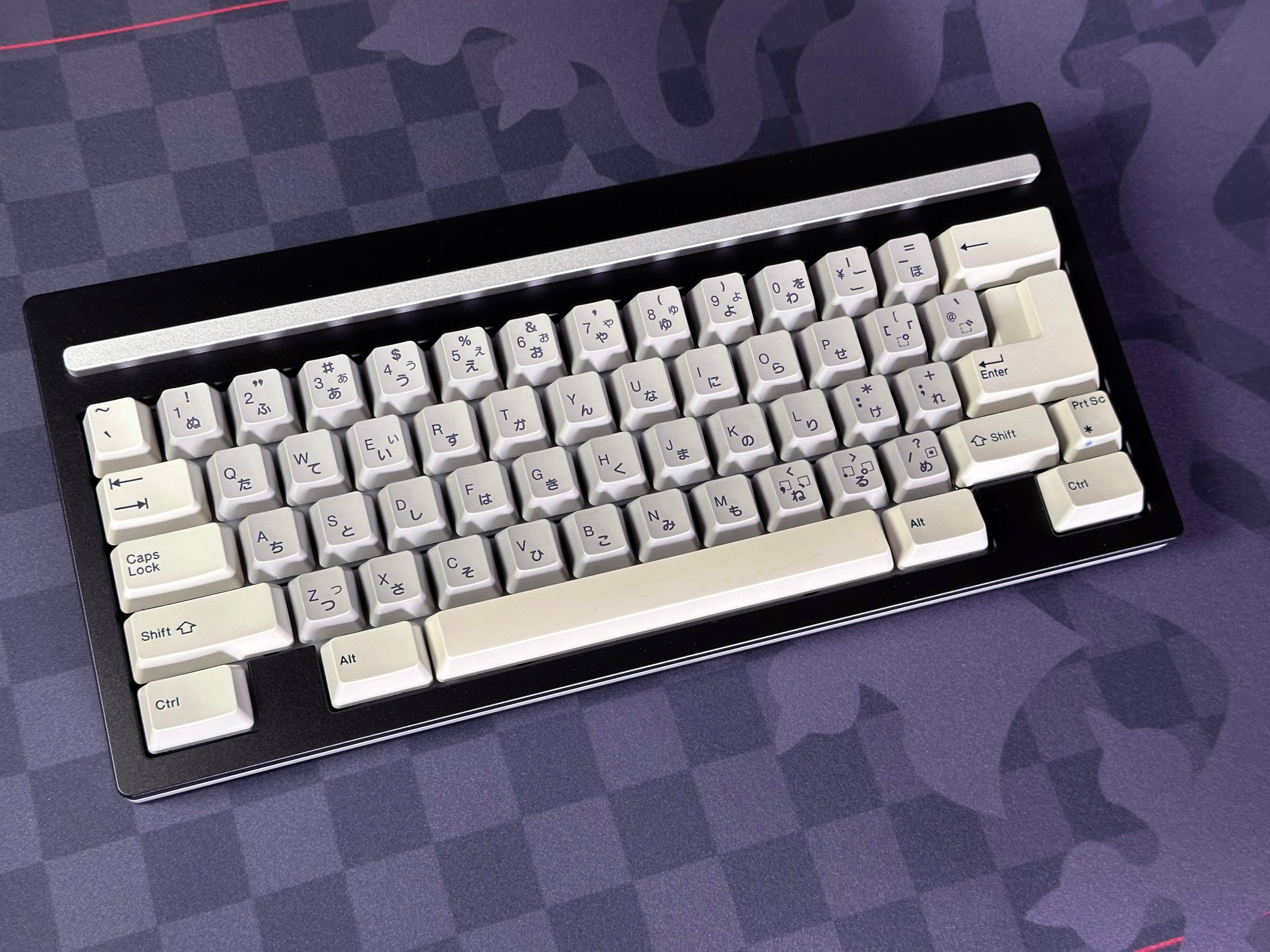 The raw aluminum highlights on this case seemed made to go with the silvery My Riport keycap set, and a reverse contrast set of 5140 mods seemed a good compliment. As usual an ISO 5140 set was combined with a BAE set in order to get a 2u backspace with the stepped enter.